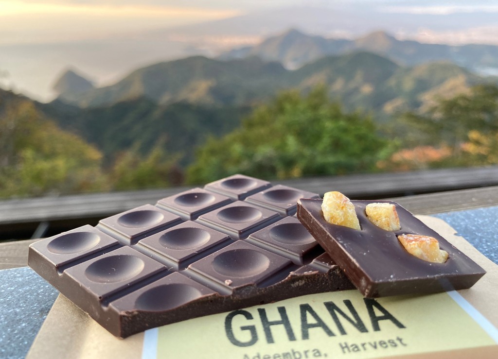 65% Dark Milk Chocolate made with only single origin Ghana cocoa beans and sugar with chopped sweet sour and refreshing yuzu peel inclusion. It’s delicious and well balanced with chocolate.